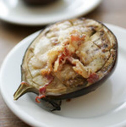 賀茂ナスを縦に割って 格子状に包丁を入れて 生ハムとパルミジャーノ オリーブオイルを垂らしてオーブンで焼く。 いい匂い。